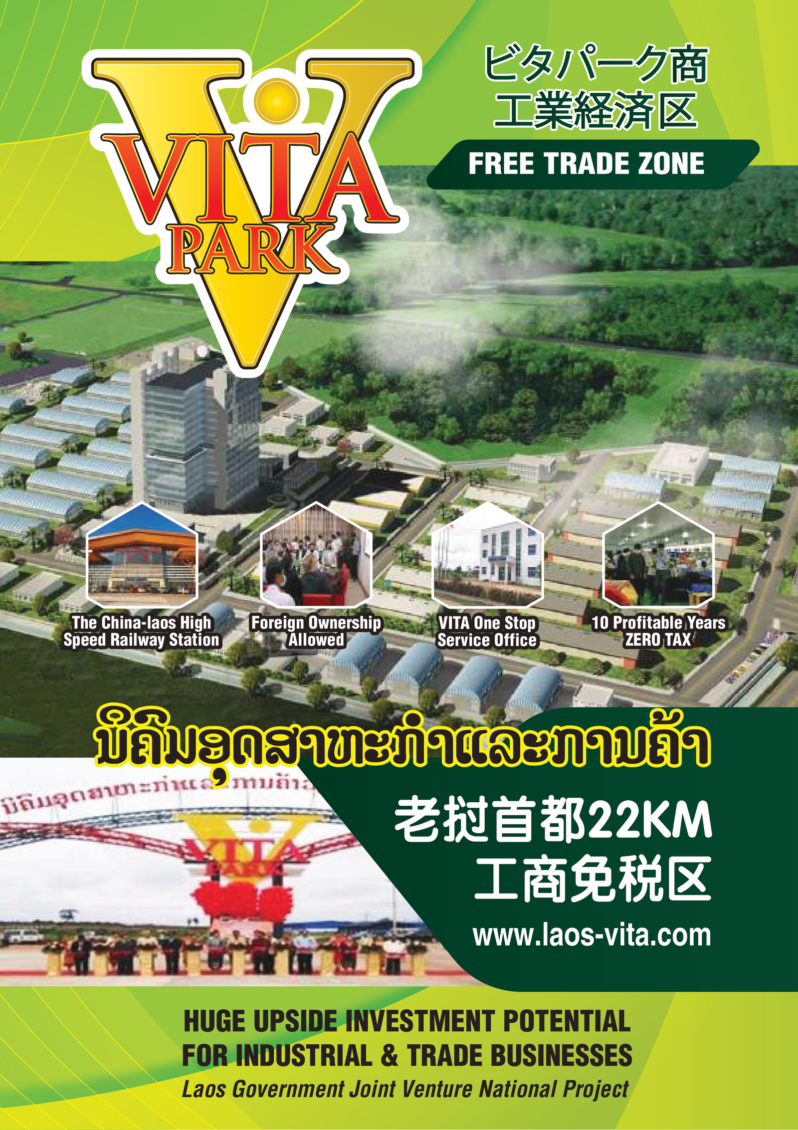 Vientiane Capital Industrial and Trade Area (Under Ministry of Industry and Commerce). Located 22km from the city of Vientiane Capital, with 100 hectares of the area and the investment of $43,000,000 from the government and a company from Taipei. The targetted investment projects are Industries like Textile, Electronic Parts, Retail Store, Trade Center, Training Center, School and Hospital. VITA Park...