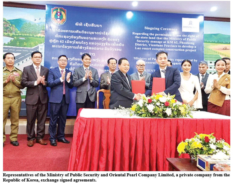 The General Logistics Department of the Ministry of Public Security recently signed documents to grant the right for the use of state land in the Km 62 area of Vientiane province for the construction of the US$2.9-billion Resort Lao Complex project....