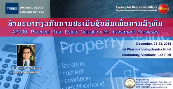 AP100: Effective Analytical Tools for Investments Date and Time: June 24-26, 2019 (3 days Seminar) Venue: Landmark Hotel, Vientiane, Lao PDR. Lao Property Valuation Sole Co., Ltd - LaoValue.com in cooperation with Thai Real Estate Business School (TREBS) organizing the 2nd Seminar on Property Valuation This course provides you effective analytical tools for real estate investment purposes with...