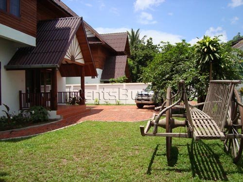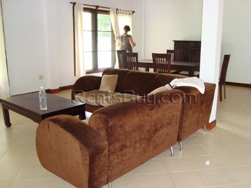 Fully furnished house in international community area with sizable nice garden, large open living room and kitchen, store room on the back of the house, about 6km from fountain area, about 60m to Mekong river, internet facility in place.