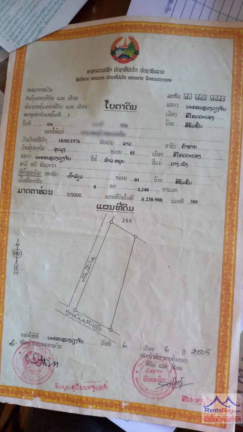 Vacant land in Sisomxeun Village, Sikhottabong District, Vientiane Capital. It is situated on the main road and in the business area. It’s suitable for residence, office, factory, farming and business premise.