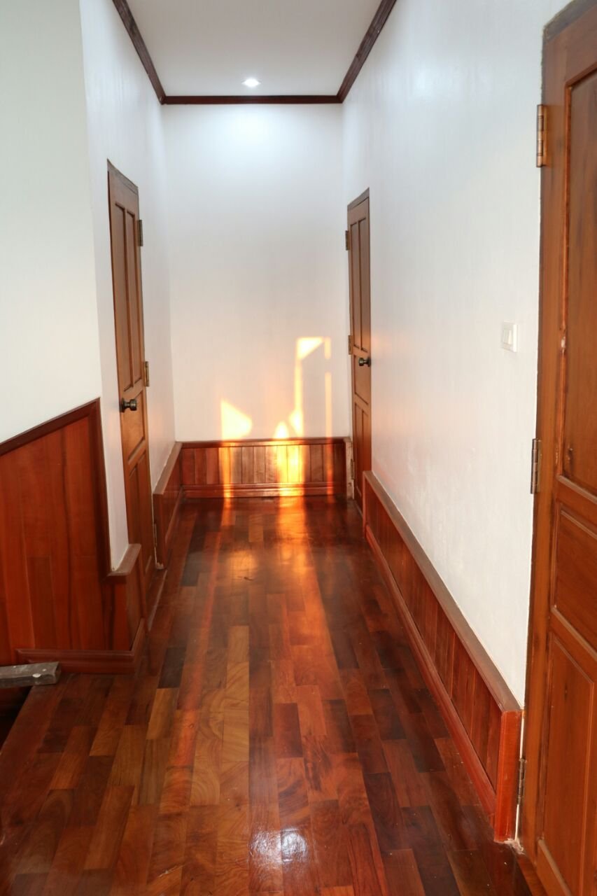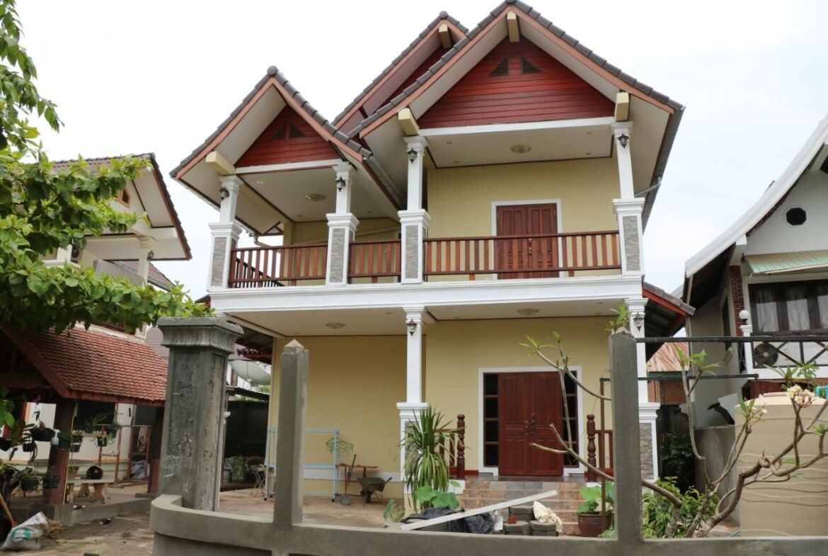 This is two-storey house in the peaceful with fully furnished has 4 bedrooms, 4 bathrooms, a living room, a kitchen, all furniture made by wooden, flooring made wooden parquet, a balcony, in front of house has parking space, some trees and flowers. It is suitable for living and the located in town is not far from Xung Chieng and 3km drive to Wattay Airport, 2km to town.