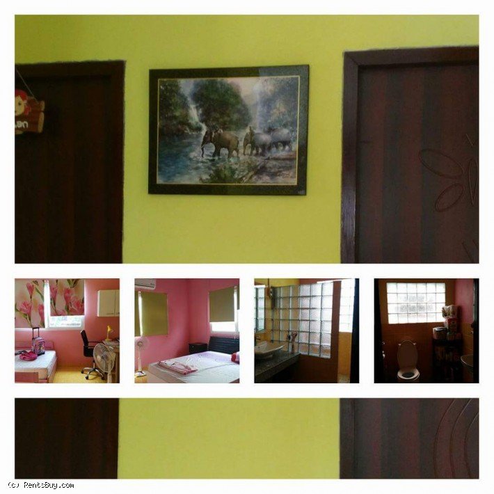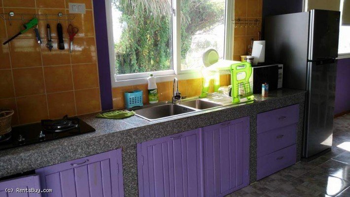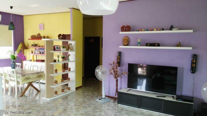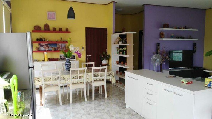 The colorful house with fully furnished. Each zone of decorating with different colors such as: living room and kitchen are painted in purple, dining room painted yellow, bedroom painted pink. There are 2 bedrooms, 1 bedroom downstairs, 1 office room and 1 bathroom. The property with fully furnished, large yard for parking and large porch for relax. In the neighborhood, there are public facilities such as: local hospital, minimarts and local fresh market.