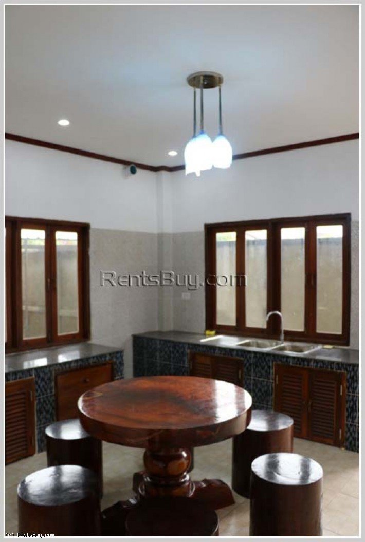 This is two storey house with fully furnished has 4bedrooms, 4bathrooms, a living room, a kitchen including new furniture, wooden flooring, celling has lamp and a balcony for relaxing. In front of house, there is a parking space, some trees and flowers. It is suitable for living. The located in town is not far from Xung Chieng and 2km to Wattay Airport.