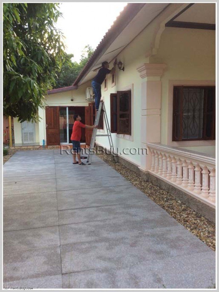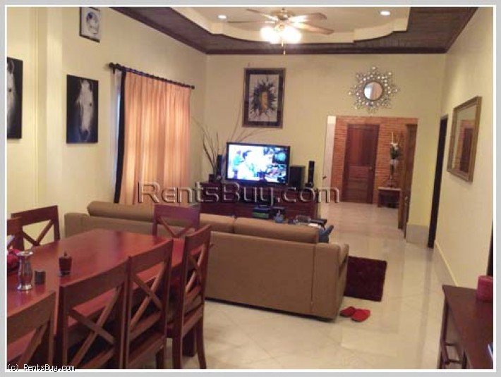 land size 23x34m, house size 8x12m, fully furnished, 3 bed rooms, 2 bathrooms, 1 storage/external bathroom, 2 kitchens, nice living room, concrete fences, 4 CCTV cameras, roofed car park, large courtyard, air conditioners and fans installed in every room; located at Nathom village, close to Ban Soufa resort and National University of Laos, same soi of Heartbeat night club and restaurant and the famous Nathom 500 Kip BBQ (local beer pub), negotiable price.