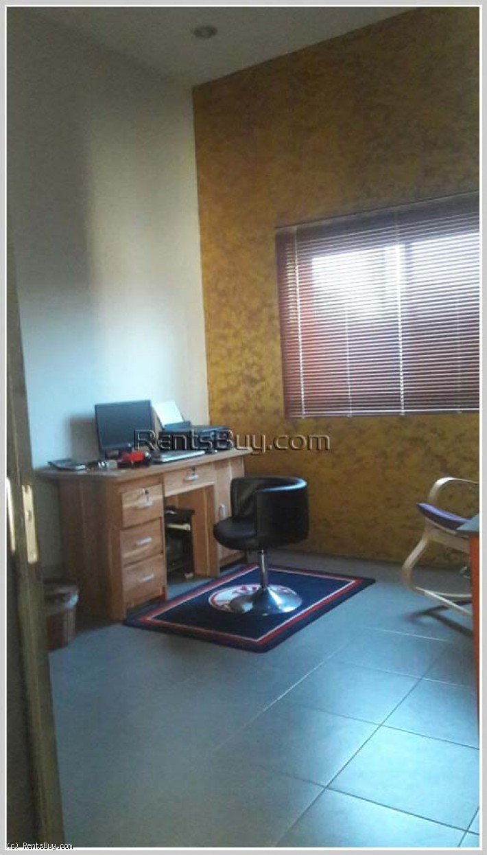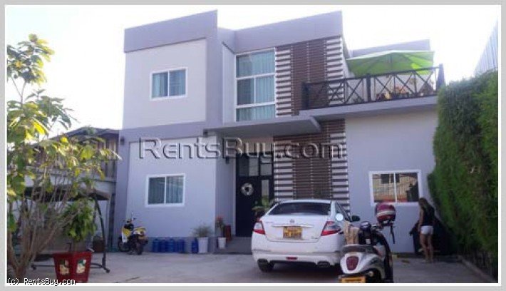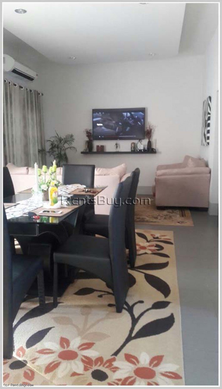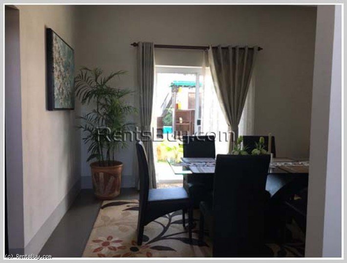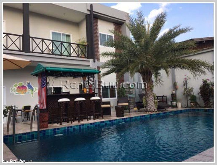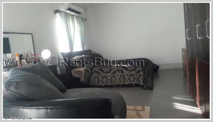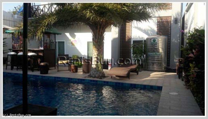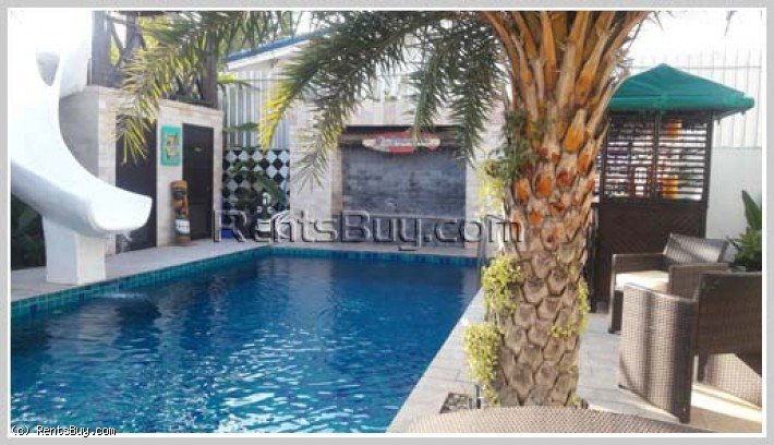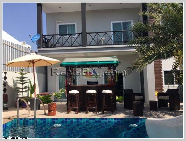 Modern house with fully furnished for rent, located in the South of Vientiane city about 4km from Patouxay, in diplomatic area near Kiettisack International School. House consists of 4 comfortable bedrooms, 5 clean bathrooms, living room, kitchen, beautiful swimming pool and car parking lot with concrete patio. In the neighborhood, there are local market, mini-mart, restaurant, pharmacy, 103 hospital, school and etc…