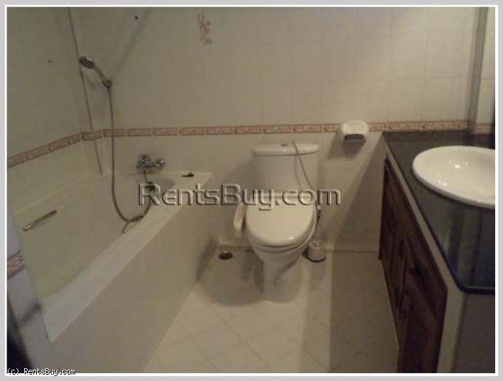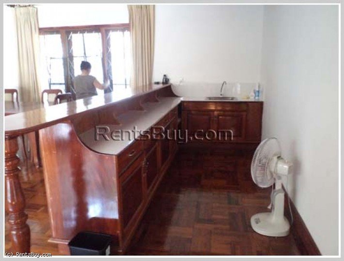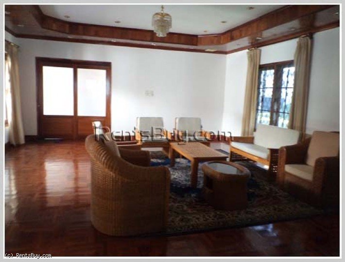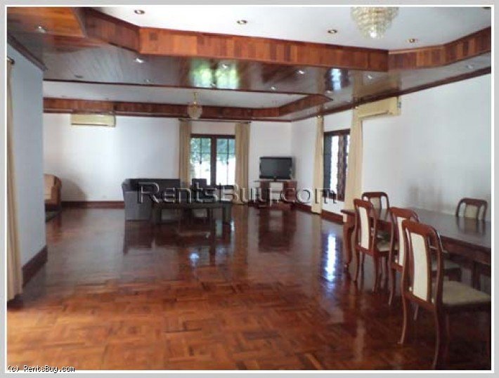 Two storey house for rent with fully furnished, 5 bedrooms with single bed and double bed, 6 clean bathrooms, spacious living room, dining room, large size of kitchen, kitchen bar counter, wooden for flooring, balcony, lush lawn front yard and car parking. The location is in the Lao and Foreign community area, close to Vientiane International School (VIS), Sengdala Fitness Center, Parisien Cafe, 23 August Garden, restaurants, shop, mini-mart, bank, etc...